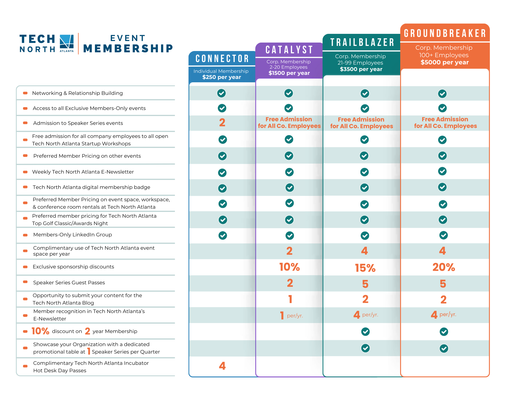 Choose the Event Membership tier that fits your goals & join our North Atlanta community of technologists, innovators and professionals.