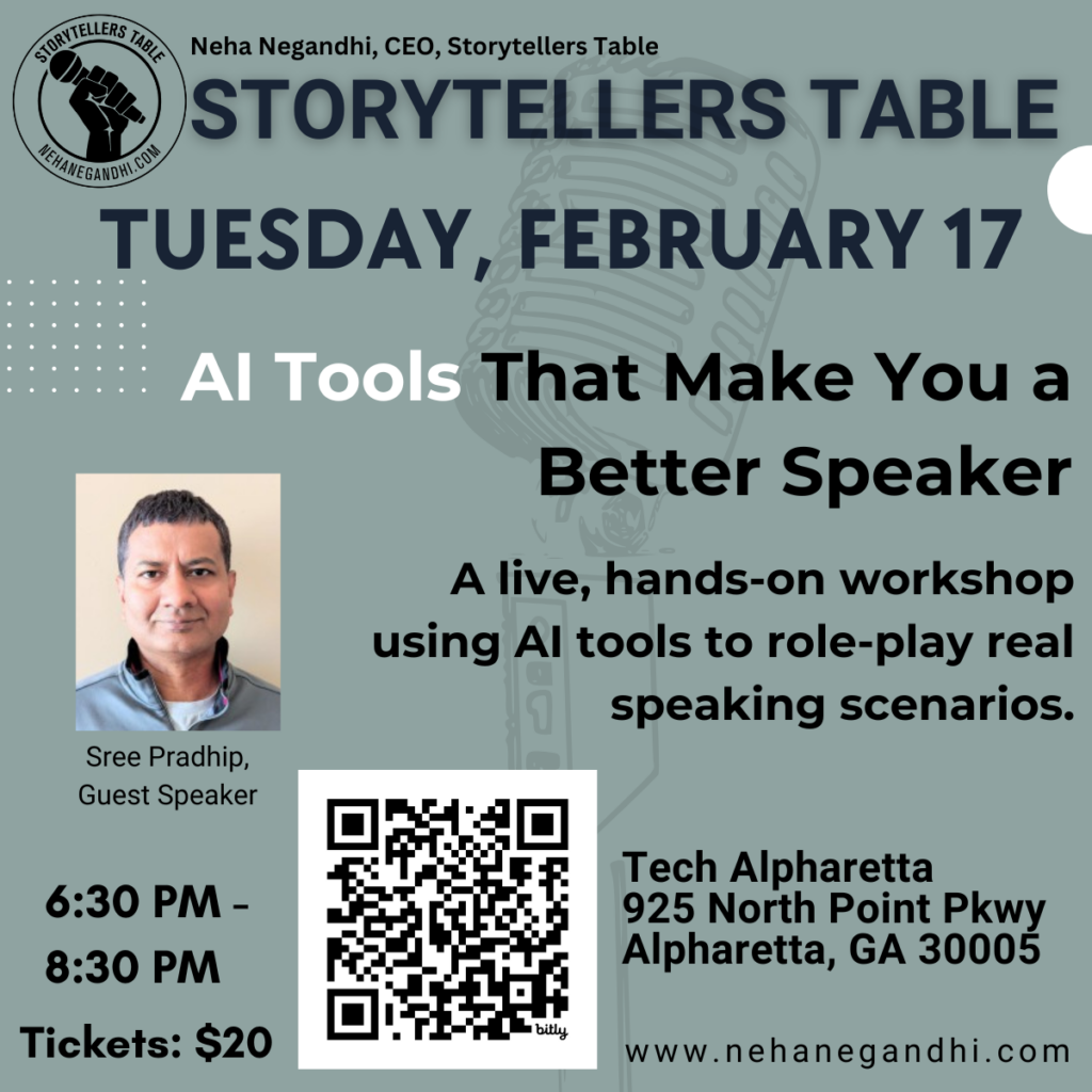 Join Neha Negandhi for the next Storytellers Table, a hands-on experience designed to help you use AI tools to sharpen your stories and strengthen how you speak. This session is built for real-world scenarios. You won’t just hear about tools. You’ll practice with them.